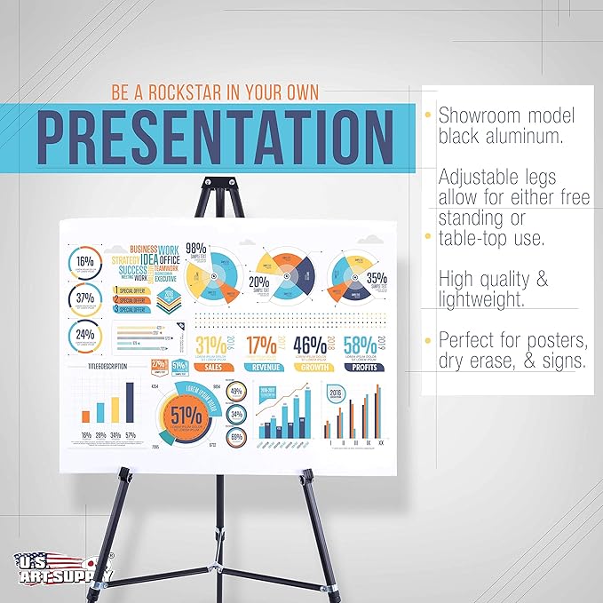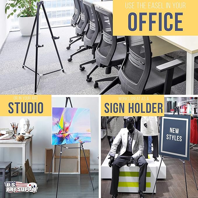 U.S. Art Supply 66" High Showroom Black Aluminum Display Easel and Presentation Stand - Large Adjustable Height Portable Tripod, Holds 25 lbs - Floor and Tabletop, Display Paintings, Signs, Posters
