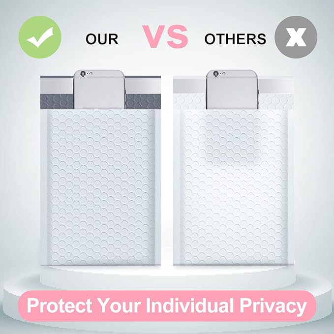 - Opaque Poly Bubble Mailers: The white bubble mailers outer size is 8.5x12 inch, while the inner size is 8.5x11 inch. With full air bubbles, our bubble mailers can protect your value products from damage caused by external impacts. The inner lining is using gray film, even if there is strong light, the items in the bag cannot be seen, which can protect your privacy well