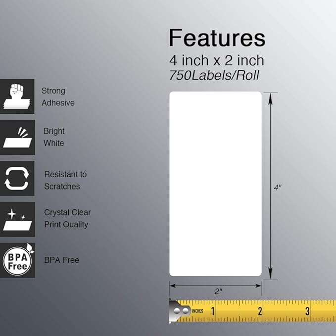- [ Specifications ]: 4 in x 2 in (102 mm x 51 mm) (750 Labels/Roll, 10 Rolls),Paper tube diameter:1"(25.4mm). No Ink Toner or Ribbons Needed! Save your money and effort.