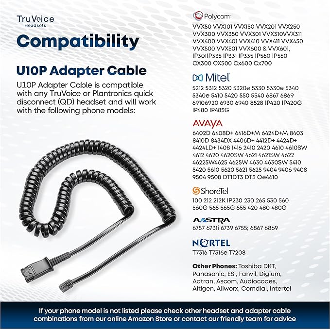 - QUICK DISCONNECT FEATURE: Our TruVoice Headset range include a Quick Disconnect Connection, this feature allows customers to detach the headset away from the adapter cable so they can move away from the desk without losing the call. Quick Disconnect headsets also allow the headset user to use the same headset with any other desk phone, Computer, Softphone or Cell Phone by just simply swapping out the bottom cable. The full range of TruVoice adapter cables can be found in our online store.