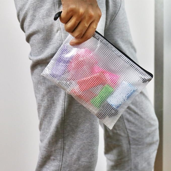 - This Mesh Zipper Pouch is made of high-quality and durable PVC material. It is thicker than similar products on the market ,and can support heavy objects,convenient, not easy to break, moderately sized, making it easy to find your files.These bags are water and dirt resistant and easy to clean.