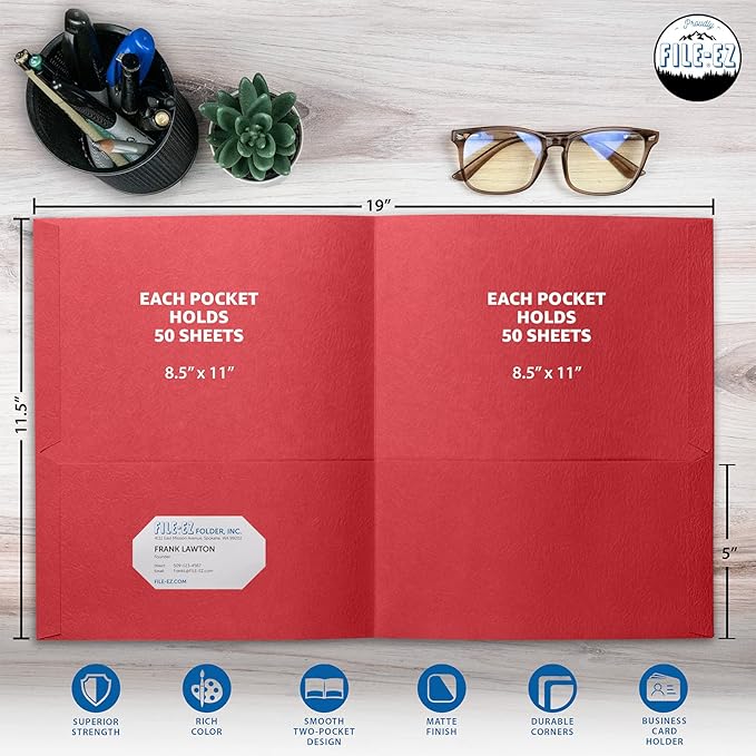 - PACKAGE INCLUDES: Your selected PACK SIZE and COLOR of Two-Pocket Folders constructed using Textured Paper, Matte Finish, Supports Letter Sheet Size (8 1/2" x 11")