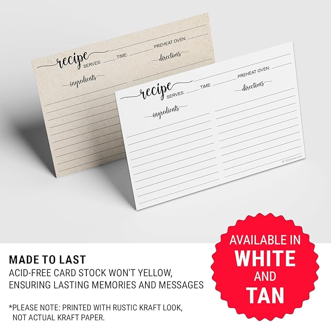 - Smudge-Proof Print: Printed on both sides with sharp, saturated, smudge-proof printing so your recipes will remain beautiful as they are passed on from generation to generation. *Please note these cards are not made with kraft card stock, but are printed with a rustic kraft appearance.