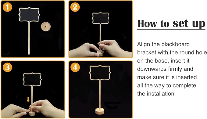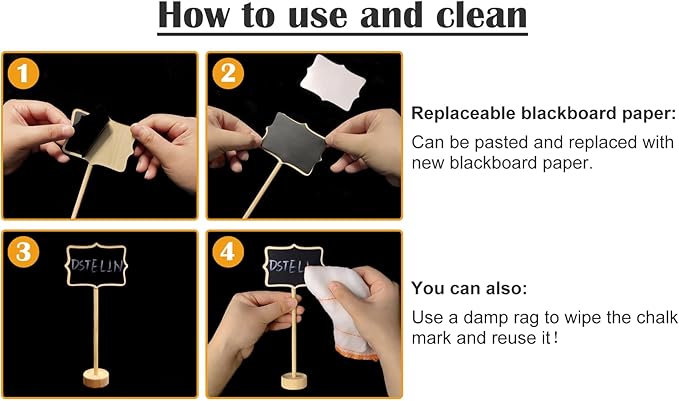- Great Material: our mini chalkboards and stands are made of High quality wood, Package includes 15 mini chalkboards, the head of the chalkboard is 2. 36" X 3. 35", there is plenty of room for you to write. (Water-based chalk and replacement stickers are included)