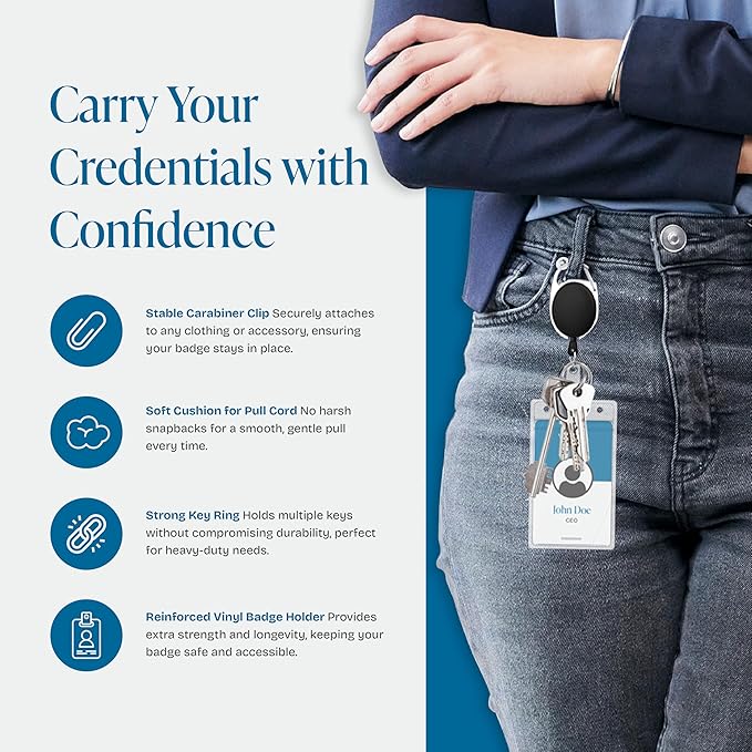 - Solid Badge Clip: Clip on and conquer. This secure, screw-fastened design keeps your badge and name tags accessible on any clothing or accessory. From pockets to backpacks, this badge reel can handle it.