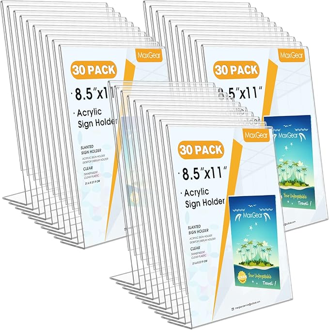 MaxGear Sign Holder 8.5x11 inches, Acrylic Sign Holder Slant Back Sign Holder Clear Sign Holder Plastic Paper Holder Table Top Sign Holder Plastic Display Stand for Office, Store, 30 Pack