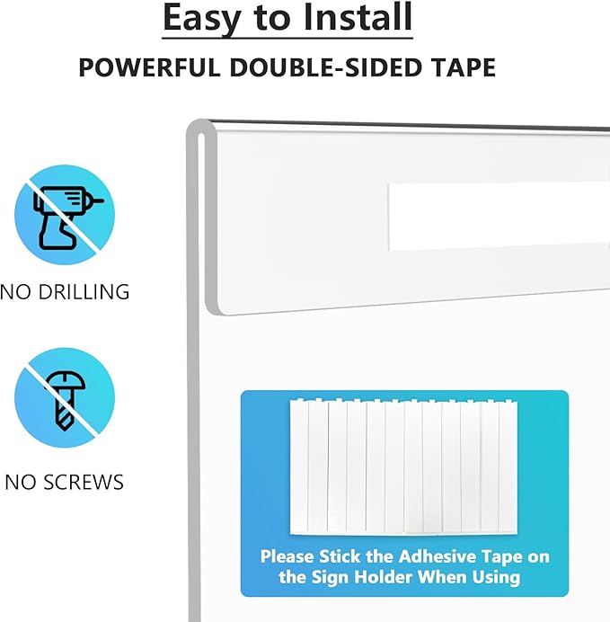 - Simple Installation: Our wall sign holders have adopted double sided tape adhesive for easy mounting. No screws, no drilling, and no tools required. Applicable to virtually any flat surface such as drywall, metal, plastic, wood, glass, etc.