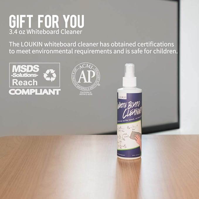 - CLEANER INCLUDED - One bottle of 3.4 fl oz whiteboard cleaner (AP certification, non-toxic & low-odor) included. Effectively clean stubborn marker ink with the LOUKIN cleaner