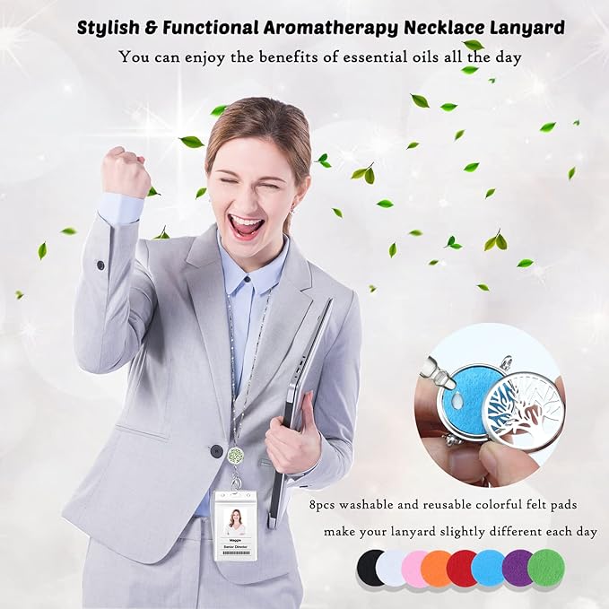 - PERFECT LANYARD SIZE: The 34inch chain is perfect length and comfortable for all day wearing, you don't have to take it off to use keys or work badges. A truly beautiful piece of jewelry that you must have at work or door access, especially sometimes you can't find a place on your shirt to clip your badge or can't find a pocket for your keys. You can change the bonus aromatherapy felt pads to match your outfits or mood, make every day a fresh start!
