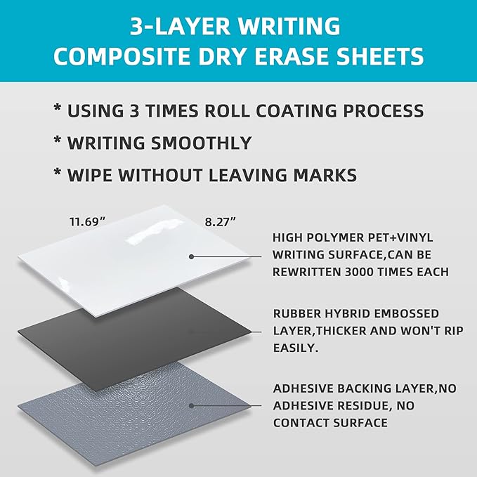 - SIZE: Dry erase stickers are 8.27''x11.69''.The combination of 6 sheets gives you 6 opportunities to express your creativity. The special embossed back helps to remove air bubbles easily.