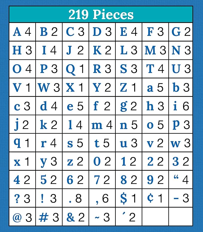 - What’s Included: This 219-piece set includes 70 pre-punched uppercase and 87 lowercase alphabet letters, 20 numbers, 22 symbols, and 20 punctuation bulletin board decorations.