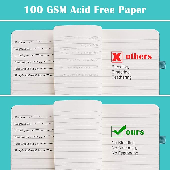 - Fountain Pen Paper: No Bleeding through for most ink pen is our paper's rigorous standard. After hundreds of test, we apply upgraded 100 GSM off-white Acid Free Paper, which helps write smoothly without ghosting, smearing and avoid eyes tiredness.