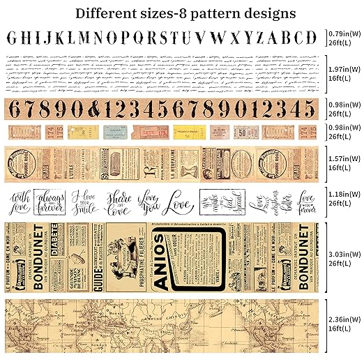 - ★[Various Vintage Designs]- A full set of 8 rolls washi tapes with different patterns.each roll is designed in nostalgic and retro styles, contains old world map, postal memory, newspaper ads, diary, tickets and more vintage designs! These nice looking retro tapes are perfect for those who love the past