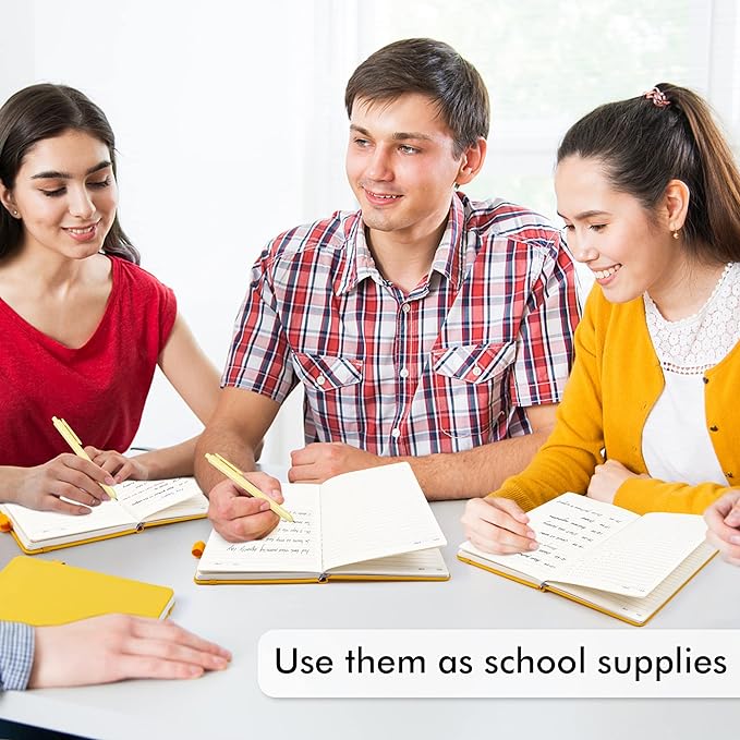 - Feela 12 Pack Classic Ruled Notebooks contains 12 classic yellow ruled sturdy cover notebooks and 12 Black Retractable Pens. Each of the notebooks measures 8.3” x 5.1”, which is perfect to carry and easily held by young girls and boys. These black cute pens are customized to be placed in the pen holder, which is pretty convenient.
