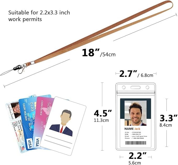 - [PACKAGES]: 6 pack durable neck lanyards-17.8"(45cm) length and 6 pack heavy duty vertical ID badge holders- 3.74" x 2.4" (9.4cm x 6.1cm) demensions fit with 3.54" x 2.24"(8.9cm x 5.69cm) card size.