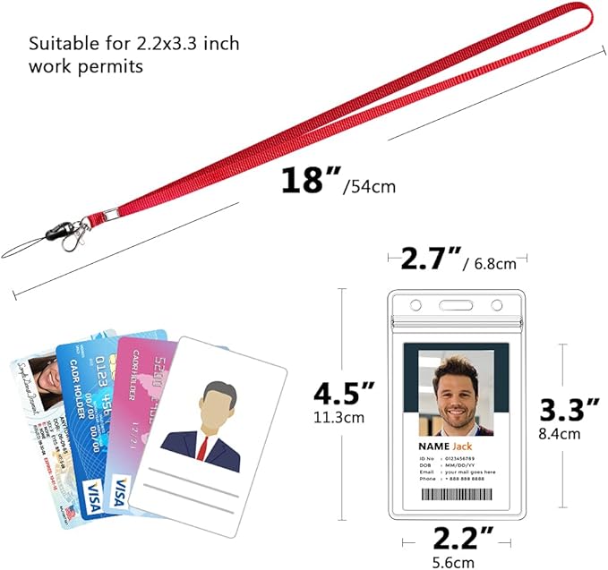 - [PACKAGES]: 6 pack durable neck lanyards-17.8"(45cm) length and 6 pack heavy duty vertical ID badge holders- 3.74" x 2.4" (9.4cm x 6.1cm) demensions fit with 3.54" x 2.24"(8.9cm x 5.69cm) card size.