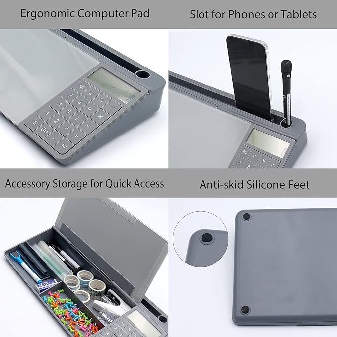 - MODERN SLEEK DESIGN: Slope desktop whiteboard is ergonomic. Basic calculator, hidden compartments, pad/mobile, marker Tray, providing a smart storage & writing solution