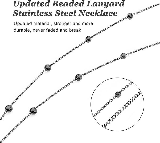 Retractable Badge Reel Lanyard with 2 Pieces ID Holder for Women, Fashion Beaded Chain Premium Stainless Steel Lanyard Necklace Water Resistant Name Badge Holder (Black)