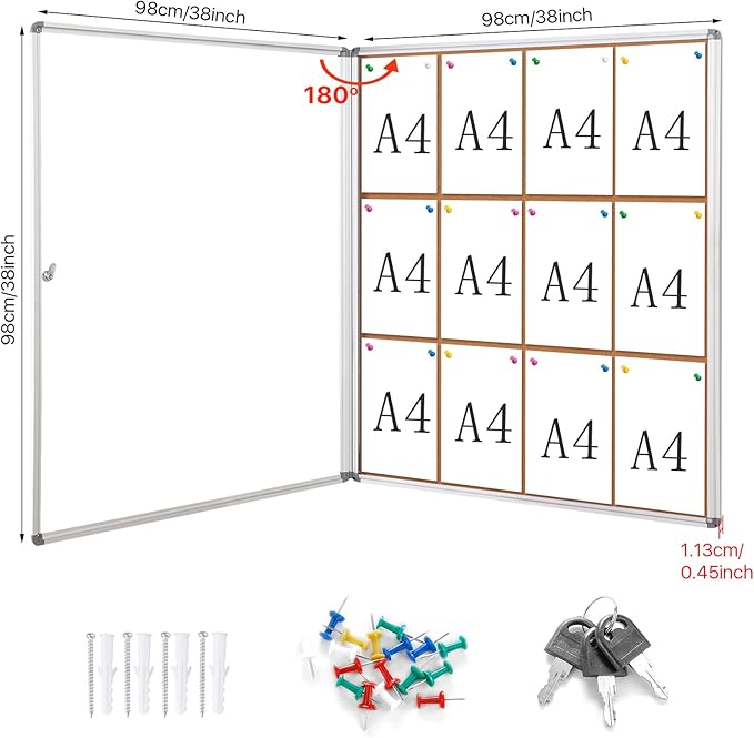 SWANCROWN Enclose Bulletin Board Case Big School Cork Pin Noticeboards Secure Cabinet for Message Guide 38x38inches (12xA4)