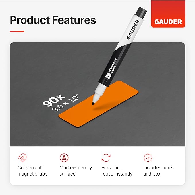 • REUSABLE AND SUSTAINABLE: GAUDER magnetic labels can be written on with the included whiteboard marker and reused repeatedly.