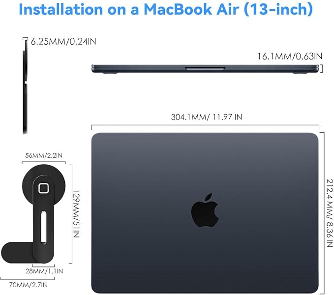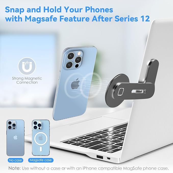 - ✅【New Upgraded Laptop Phone Stand】Laptop side magnetic phone mount is for iPhone 14, iPhone 13 and iPhone 12 Series, other cell phone can also use it by attached metal plates! (NOTE: No metal plates needed when wearing a magsafe case or no case. A metal ring sticker comes for other phones or non-magsafe case.)
