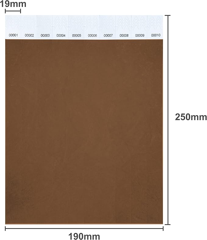 - Brown wristbands are10" long and 3/4" wide. A piece of paper is 10 wrist straps. 100 wristbands have 1-100 consecutive numbers.
