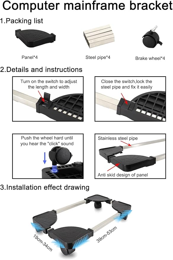 - 2.Our CPU holder has adjustable size, adjustable length range of 15.5-22 inches, and adjustable width range of 9.06-14.57 inches.If you're looking for a decent wheeled base for all kinds of differently-sized computers,this is a good choice.Perfect stand for large computers.tower stand