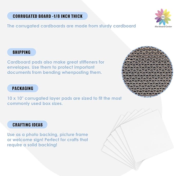 Mat Board Center, 25 pack 10x10 Corrugated Cardboard sheet, 1/8 inch thick, for Mailing, Box & Shipping, Cardboard Backing, Craft Card Board