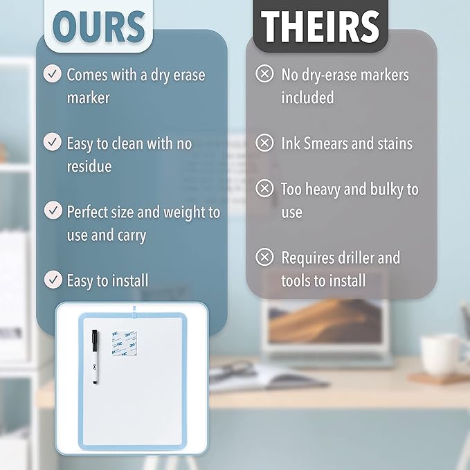 - Package Includes 1 dry erase board with 1 black dry erase marker and 4 double-sided tapes. The dry erase board is perfect for home, office, or classroom use.