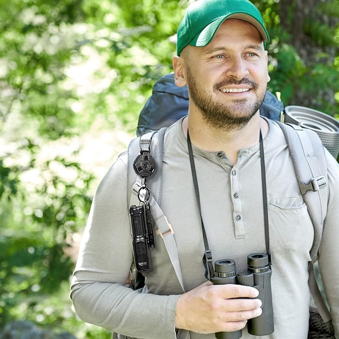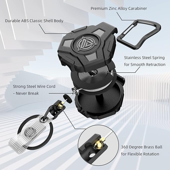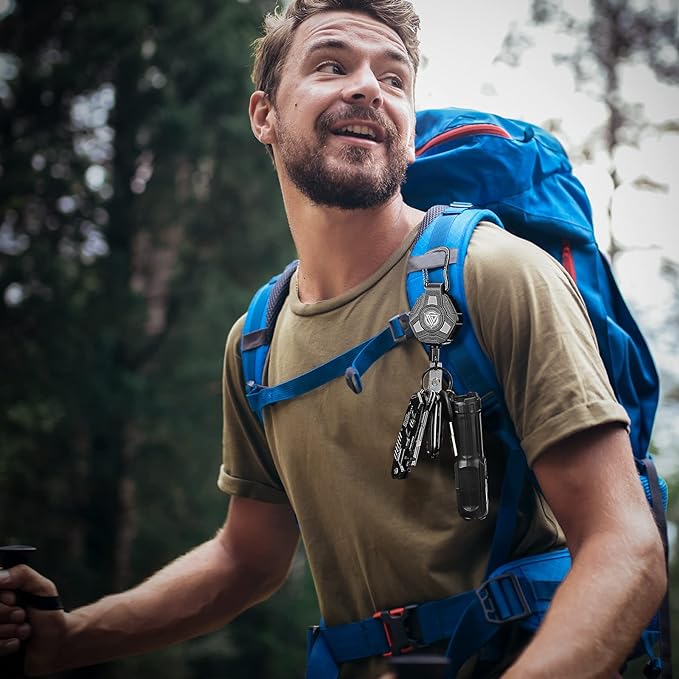 - Multi-Function: The retractable keychain designs with a zinc alloy carabiner can be easily attached on your belt loop, handbags, backpack or outdoor tent. This badge reel comes with a key ring and a badge buckle. In addition to hanging keys and badge holder, it can also hang pliers, wallets, pocket knives, flashlights, screwdrivers and other items.