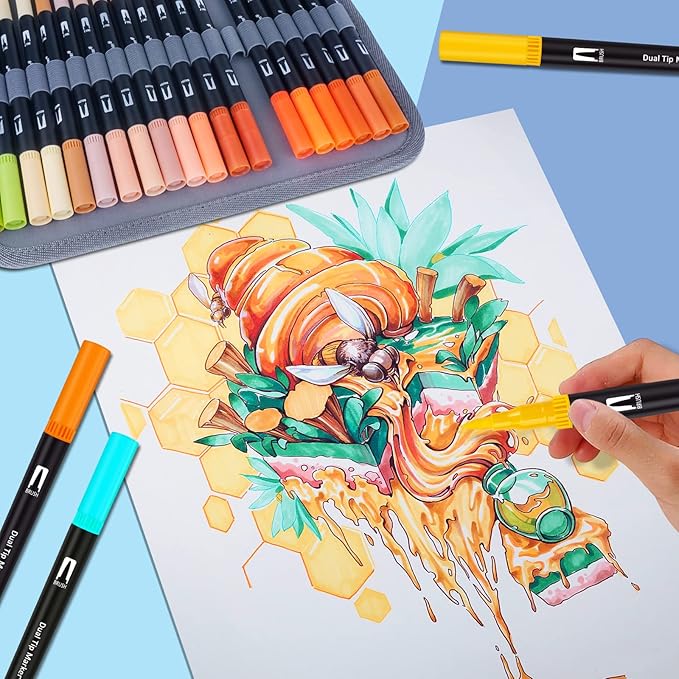 - ❤DUAL TIP DESIGN ART MARKERS❤:1-2mm fantastic brush & 0.4mm fineliner. The brush pen tip can work well for hand lettering, coloring books, signing, designing, art projects, and coloring in large areas. The fine pen tip can be used for sketching, doodling, writing, and intricate coloring books.