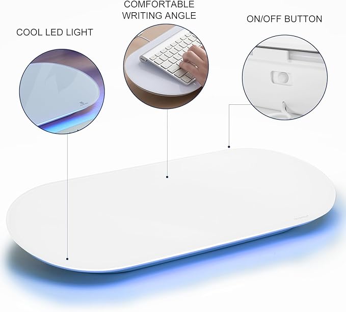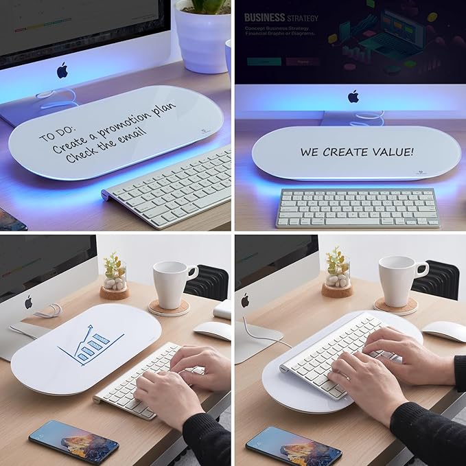 - PERSONALIZED DESIGN: The 17" X 7" desktop glass whiteboard is designed with a string of blue lights around the board, keep the usb cable plugged in, get a cool led whiteboard. The oval plate makes you feel better to hold and save more space on the table.