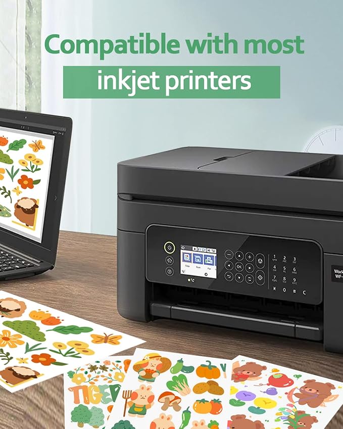 - 【Compatible with most printers】 Glossy vinyl sticker paper is compatible with inkjet printers, laser printers and magnetic printers manufacturers such as Epson, HP, Brother, Canon, etc. Easy to use, just drop directly into the printer. To avoid errors when printing, make sure to print on a chalky white surface.