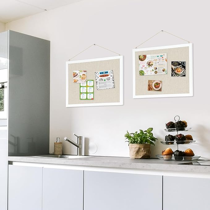 - [Decoration - 2-pack] -- 16" x 12 " linen cork board is a suitable decoration for bedroom, kitchen, office, and shop. Its white frame combined with the linen board surface, adds the aesthetic to the space. You can pin photos, pictures, and paintings to beautify your room.