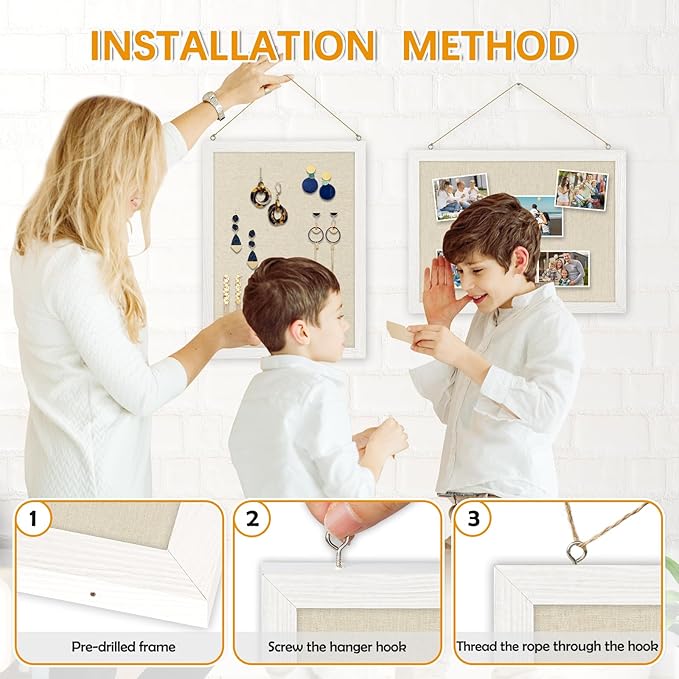 - 【Easy to Install】2 sets of mounting accessories, 20 wood pushpins, and 2 hemp ropes included. We'll pre-drill the holes on frame for horizontal mode. You can hang the small bulletin board for wall by yourself, horizontally or vertically. Moreover, you can combine two cork boards as you like.