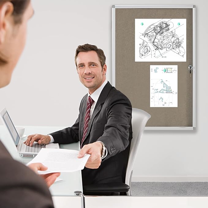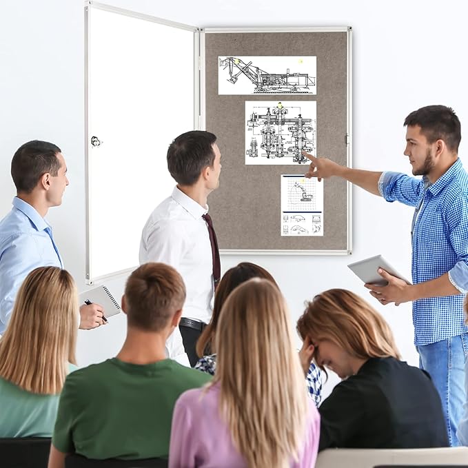 Enclosed Bulletin Board Lockable Display Case Message Board with Locking Door for Indoor, Grey Felt, Aluminum Frame, 36 X 24 in