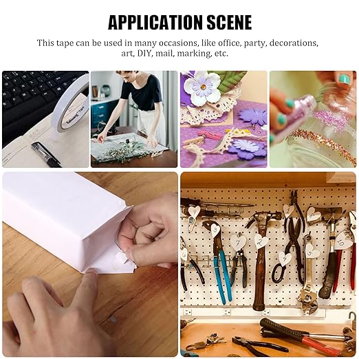 - Strong Adhesion: Double face tape adopts high quality adhesive, so this double side tape has stronger viscosity than normal tape. By using extra strong double sided tape craft roll, you can stick two items (e.g., paper) together firmly. Sticky tape can stick tightly to various surface, like glass, fabric, metal, tile, wood, paper, plastic, marble, leather, wall, balloon, especially for paper. Note: for better effect, please keep the object surface clean and smooth before stick on.