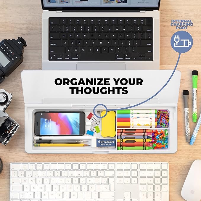- Elevate Your Set Up - Designed with a dedicated slot for your smartphone and tablet, this desktop glass whiteboard helps you maximize your workspace. It's even designed with a nifty charging slot.