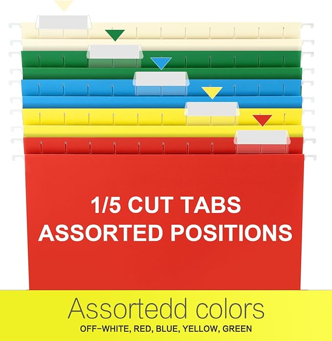 - HANGING FOLDERS SET: Contains 60 extra capacity folders with 60 cardboard supports, 60 printable label sheets, 60 clear plastic tabs and comes in 5 assorted primary colors (beige, red, blue, yellow, and green) to make color coded filing a snap.