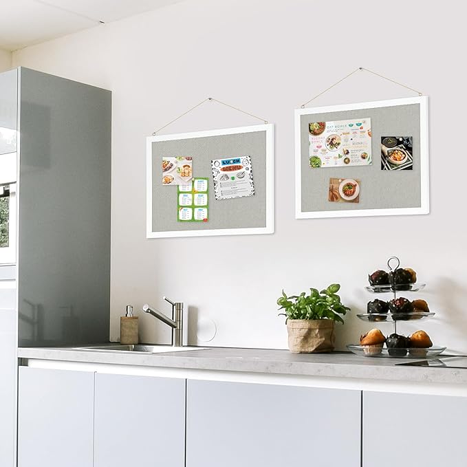 - [Decoration - 2-pack] -- 16" x 12 " linen cork board is a suitable decoration for bedroom, kitchen, office, and shop. Its white frame combined with the linen board surface, adds the aesthetic to the space. You can pin photos, pictures, and paintings to beautify your room.
