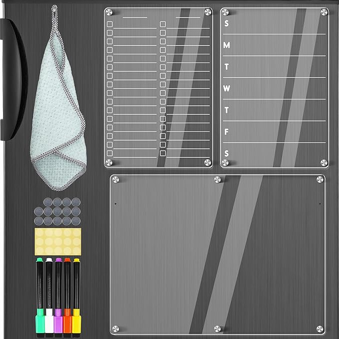 - [Easy to Write, Easy to Read, Easy to Erase] Our 3 Pcs fridge whiteboard magnetic is made of 0.12 inches clear thick acrylic, not easy to scratch and break. The magnetic clear dry erase board for fridge surface is easy to clean and erase, you just use our cloth with water for complete cleaning. Your magnetic meal planner for refrigerator without leaving any stains or ghosting.
