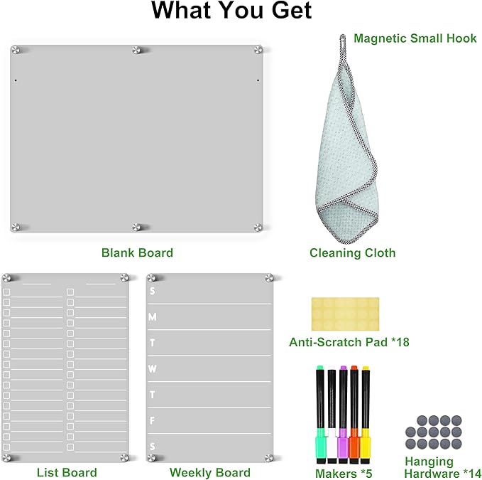 - [Satisfaction Guaranteed] We are very confident with clear acrylic board set and also your satisfaction is all that matters to us. If you find any problem or unsatisfied, feel free to contact us or the team on amazon. If Amazon cannot refund your purchase, we'll provide you the best service or the refund of the fridge whiteboard set.