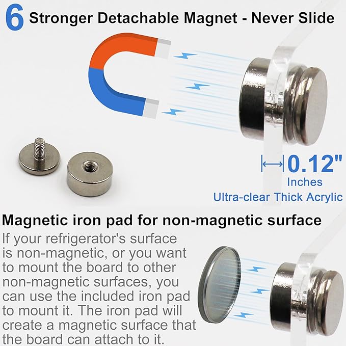 - [Anti-sliding & Anti-scratch & Sturdy Design] Magnetic acrylic board for fridge set uses 6 extra strong detachable magnets, which can be firmly attached to the refrigerator or various metal surfaces, with very strong grip. Acrylic refrigerator calendar set won't fall off or move easily unless manually. The acrylic dry erase board for refrigerator also suitable for slightly curved refrigerator door. After removing the magnets, you can hang it anywhere.