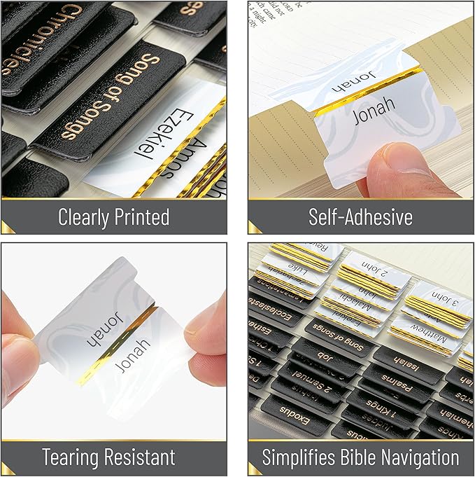 - Presented in a matte finish, the tabs offer a refined look that complements any Bible. The understated elegance ensures that they neither distract nor detract from the sacred text but rather enhance your study experience.