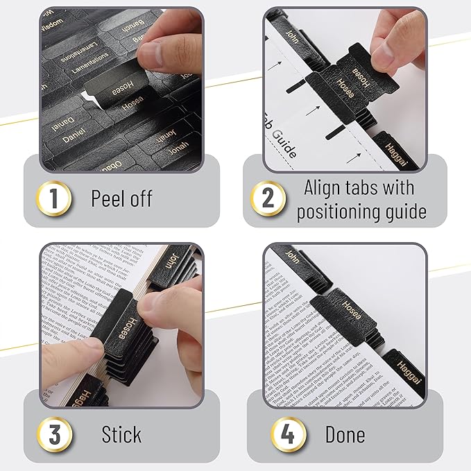 - Our Bible tabs come with an included positioning guide, making them super easy to use. Whether you're a seasoned scholar of the Good Book or just getting started, this guide ensures you'll place each tab precisely where it needs to go.