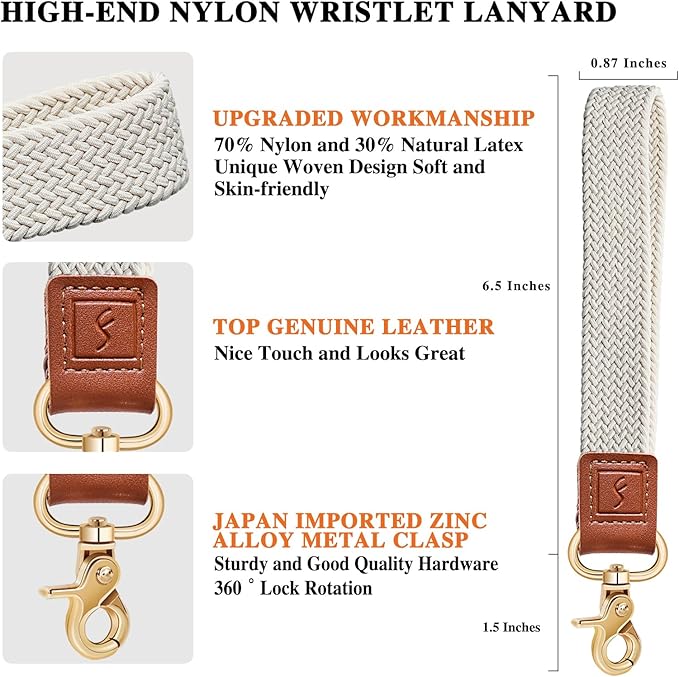 - Upgraded Stretchy Design: Fishent wrist lanyard is roughly 0.87 inches width and 6.5 inches length from the bottom of the leather to the top of the wrist key loop, with super-soft weave strap(stretchy), genuine leather and quality metal wristband keyring clasp lanyards for keys. The hand wrist lanyards keychain adopt unique upgraded stretchy nylon design, the wrist strap is soft and textured. Comfortable to wear and not easily deformed
