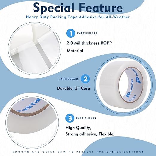 - Strong Excellent Adhesive: With strong & secure BOPP acrylic adhesive, the sturdy tape sticks very well and holds boxes together. The extra strength of the material prevents clear packing tape damage during shipping. Perfect long lasting bonding range in performance for shipping and storage.