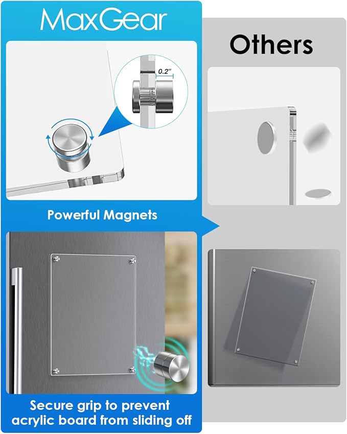 - Anti-sliding/scratch & Powerful Magnetic Design: Four Powerful magnets keep the acrylic dry erase board secure without scratching your fridge, even during opening and closing.(Note: this clear whiteboard is not suitable for non-magnetic stainless steel fridges or curved fridges/refrigerators.)