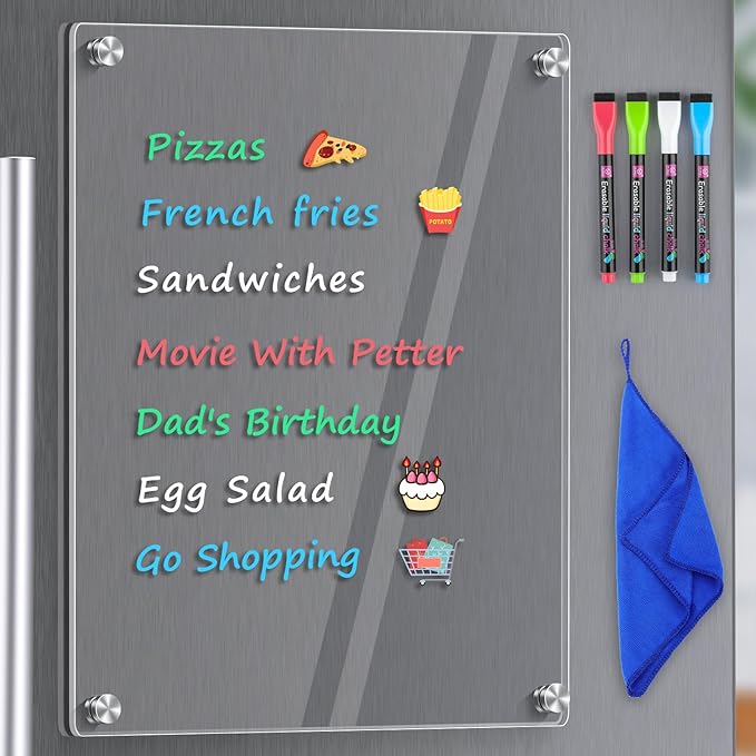 - Match All Fridges & Multipurpose Use:The fridge white board set comes in 4 vibrant colors that are legible on any background, light, or dark surface and more.The acrylic magnetic dry erase board can be used as a planning board, meal board, to-do list, noteboard, reminder board,weekly board, menu board planner, schedule board, and so on.