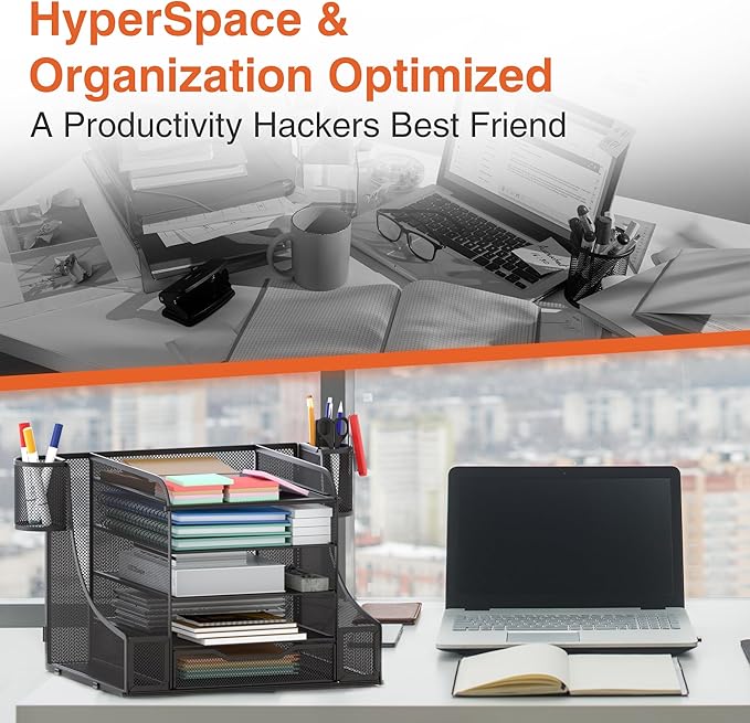- Won’t Make You a Sardine - Hyper Space Optimized - A file folder best friend, and an entrepreneur dream, this is the Desk Organizer to get if you’re a time-hacking, productivity-hacking genius, who wants to leverage your deskspace to increase throughput, not constantly moving obnoxiously large desk organizer out of your way.
